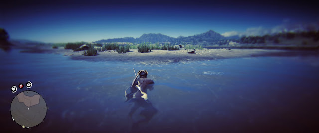 Оказывается, игуаны относятся не к мелкой, а к «небольшой» дичи. Что означает полную бессмысленность охоты на них с чем-то, кроме мелкашки. А её-то я с собой и не взял. По счастью, тринкет из легендарного оленя в очередной раз таки сработал, и отличную шкурку я таки добыл даже с двухзвёздочного трупа. На это я убил добрый час. После этого я немного покрафтил, и воспользовавшись шорткатом, отправился в лагерь. По пути мне попалась пара белок и очередные придурки, взламывающие сейф динамитом. Жаль только они забыли, что подожгли шнур, когда решили потрындеть с Артуром.